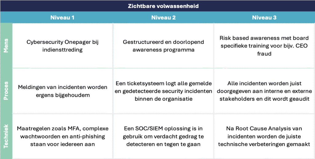 In de markt zien we verschillende niveaus van voorbereiding op NIS2. Hierbij kijken we naar de drie bekende pijlers van: Mens, Proces en Techniek. We bekijken die pijlers over twee assen. Als eerste, hoe volwassen ben ik als organisatie? En als tweede, kan ik dat laten zien indien gevraagd?